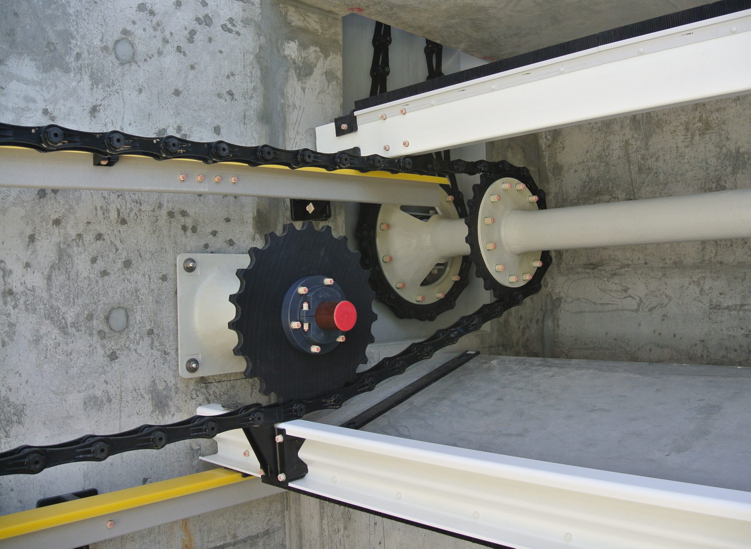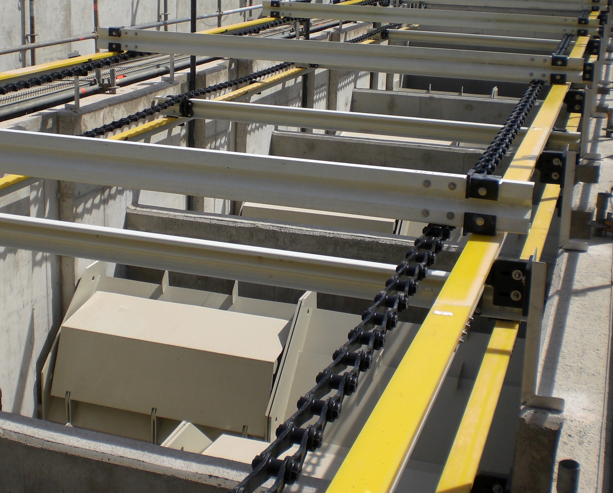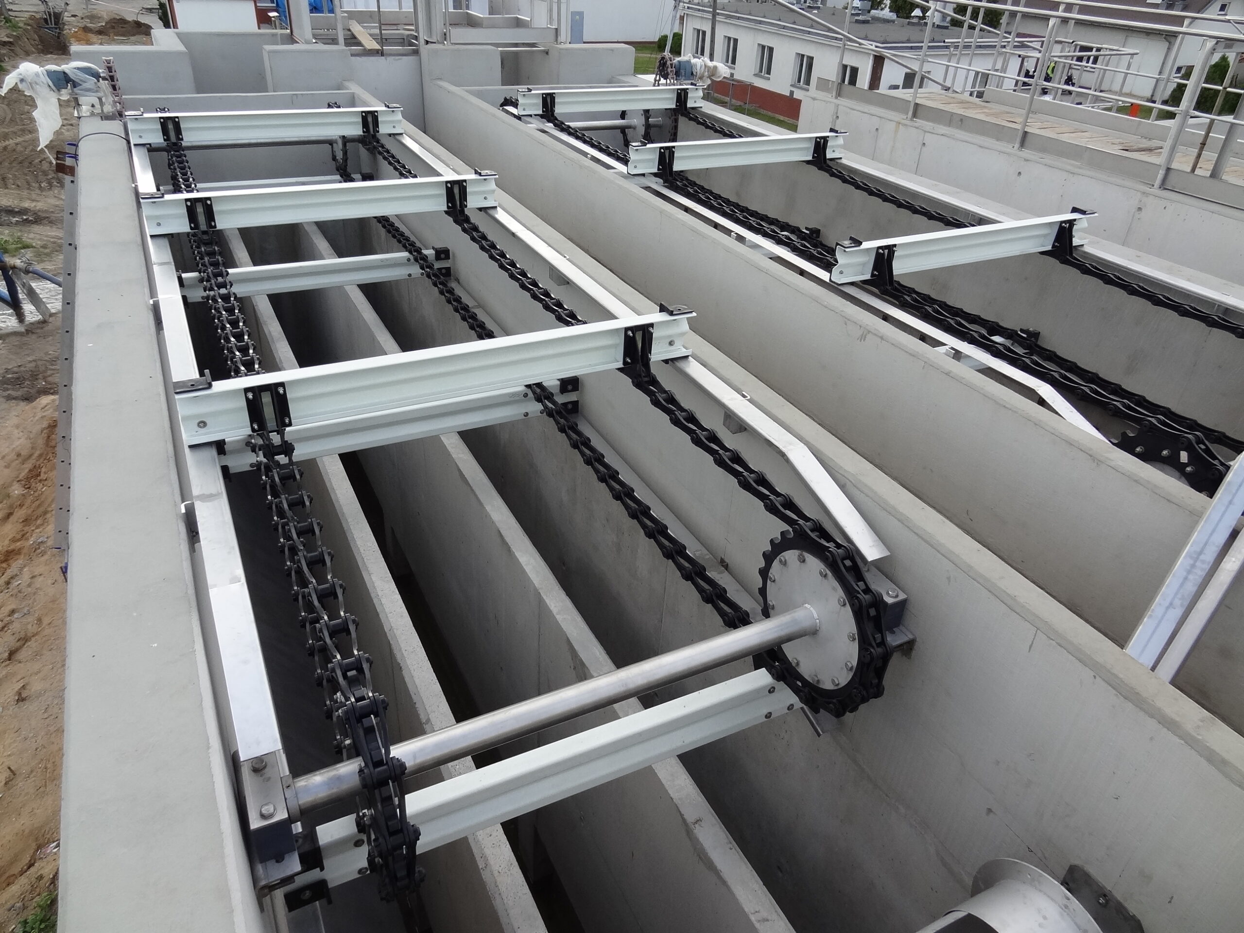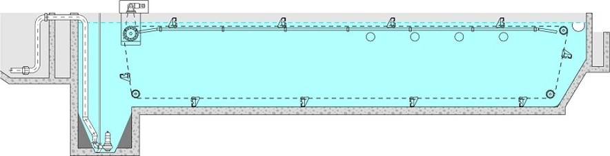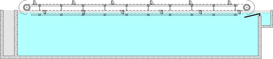 - Гнучкі можливості конфігурації – система індивідуально добирається до геометрії резервуара, навантажень та вимог процесу (зокрема шляхом вибору матеріалів, кроку ланцюга, кроку установки скребків, та власне профілю скребка).