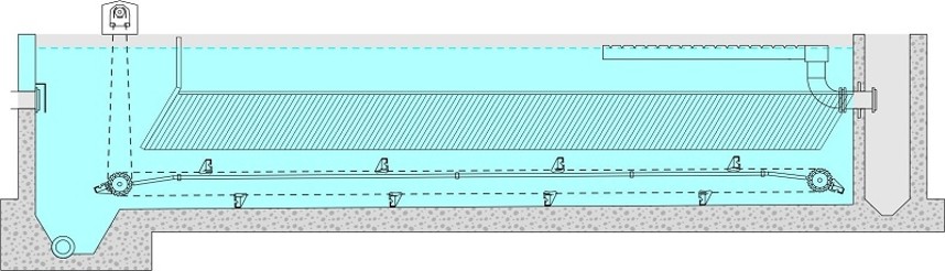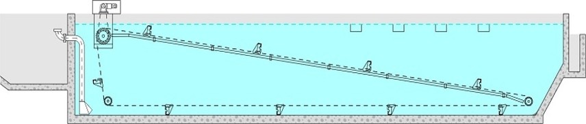 - Безпечна конструкція – легка підвісна система скребка не створює додаткових статичних і динамічних навантажень, зберігаючи цілісність бетонної конструкції резервуара.