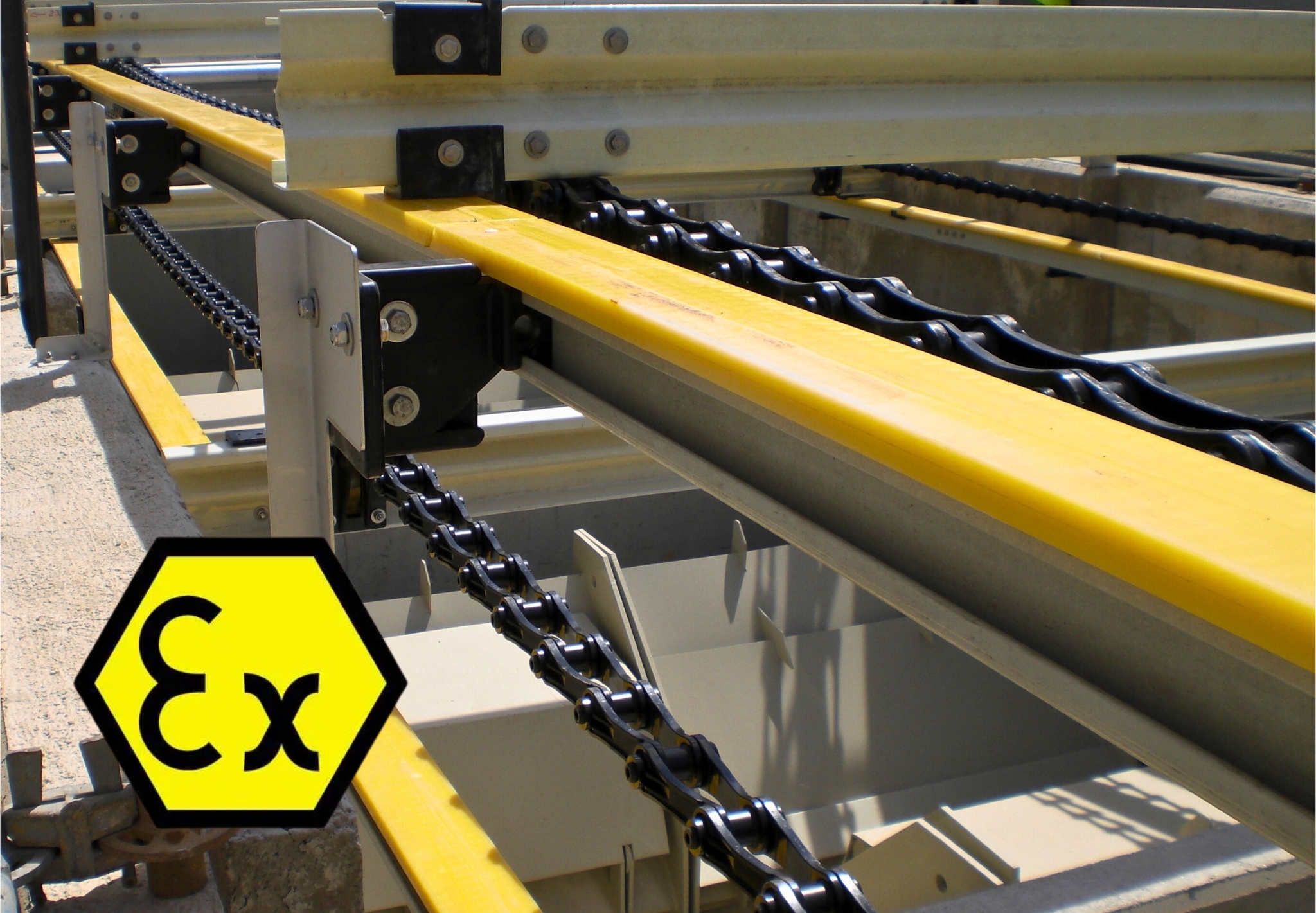 Система скребків ESMIL x Probig® повністю відповідає вимогам ATEX щодо обладнання, призначеного для роботи у вибухонебезпечних зонах. Сертифікація охоплює всі елементи механізму – від приводу до робочих конструкцій (ланцюги, скребки та інше) – що робить нас єдиним постачальником на ринку України з повною сертифікацією ATEX для всієї системи навіть для зони Ех0.